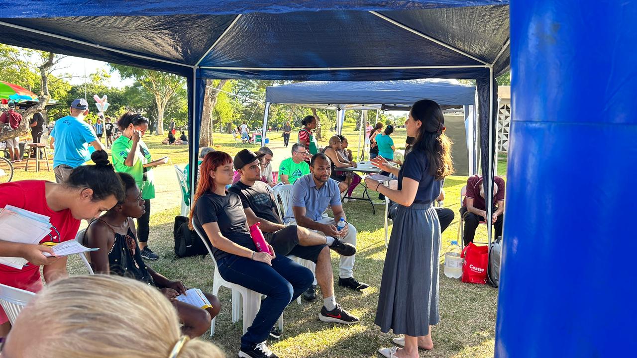 A ação ocupou parte da praça com cadeiras, mesas e equipes distribuídas em diferentes frentes de atendimento. Durante a programação, moradores aguardaram atendimento, participaram das triagens e receberam orientações em um formato aberto, realizado fora da estrutura física da instituição.