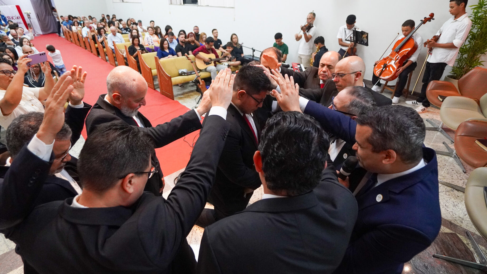 Entre orações, abraços e palavras de orientação, o pastor Renan foi oficialmente ordenado ao ministério pastoral, ao lado de sua esposa Poliana, que juntamente com ele participa do compromisso ministerial, um gesto que reforça o caráter espiritual e familiar da cerimônia.